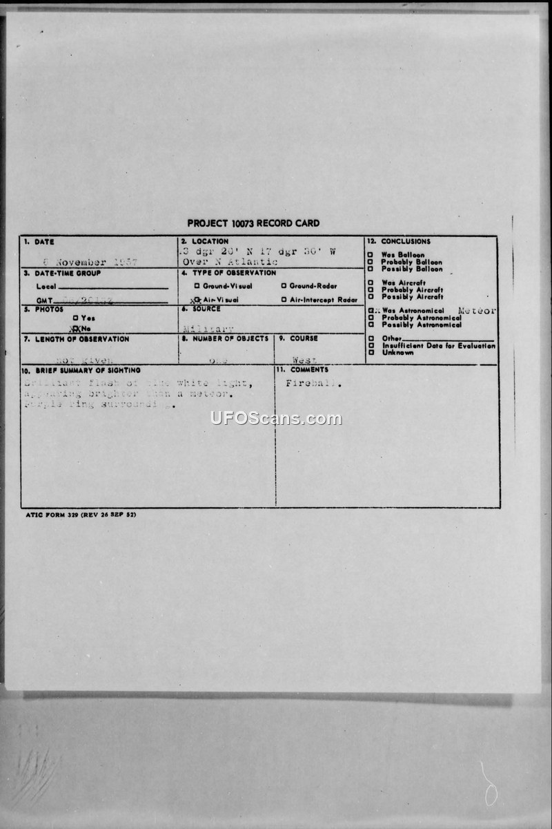 A 1957 report of a brilliant blue-white light with a purple ring observed by two aircraft over the North Atlantic. The event was officially classified as a meteor.