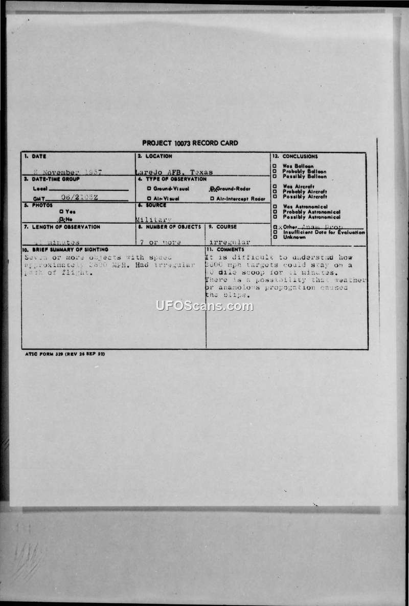 Project 10073 Record Card — Laredo AFB, Texas, 8 November 1957