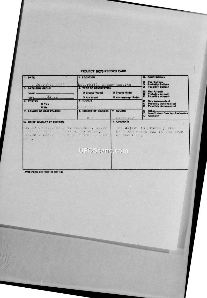 Project 10073 Record Card — Haverhill, Massachusetts, 8 November 1957