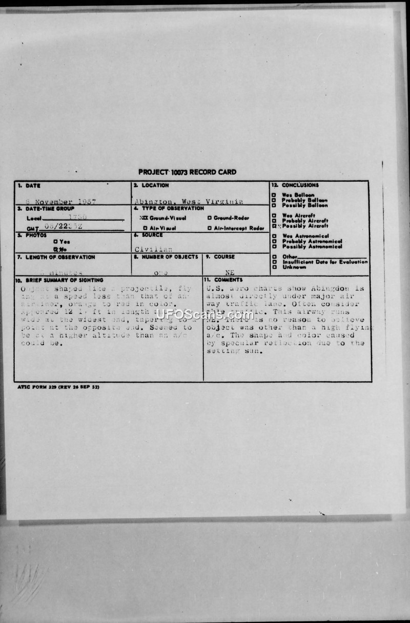 Project 10073 Record Card and Air Intelligence Information Report — Abingdon, West Virginia, 6 November 1957