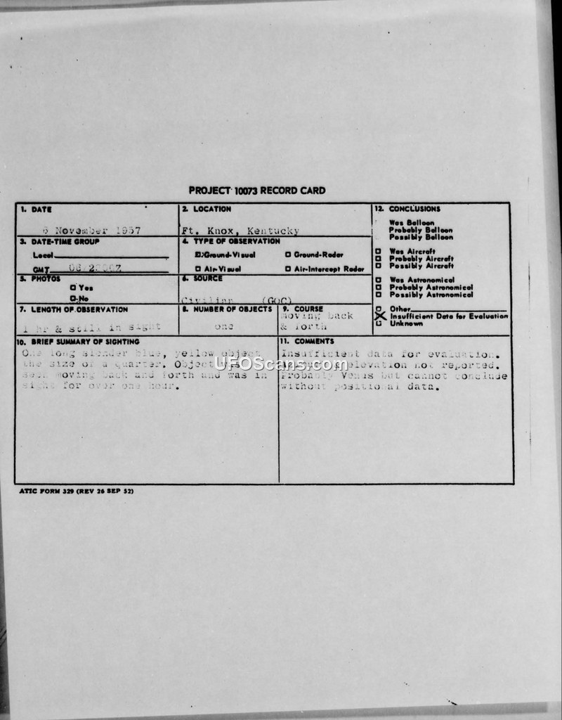 This document is a Project 10073 record card detailing a UFO sighting reported on November 6, 1957, at Godman Field, Fort Knox, Kentucky. The witness, a 31-year-old U.S. Army member of the Military Police detachment and a qualified Ground Observer Corps (GOC) observer, reported seeing a single, long, slender object that appeared blue and yellow in color. The object was described as being the size of a quarter and was observed moving back and forth for over an hour. The report notes that the observer remained in sight of the object at the time of the report. The official evaluation of the incident concluded that there was insufficient data to make a definitive identification. The report explicitly mentions that azimuth and elevation were not provided by the observer, which hindered the analysis. Investigators noted that weather balloons were launched at the time of the sighting and suggested that the object might have been the planet Venus, though they could not confirm this hypothesis without more precise positional data. The document includes a standard record card format and a teletype-style summary of the incident.