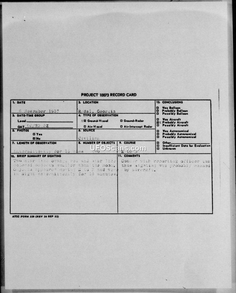 A 1957 sighting report from Rydal, Georgia, describes two orange-red, star-like objects moving at low altitude. The military investigation concluded the objects were likely aircraft, potentially distorted by atmospheric haze.