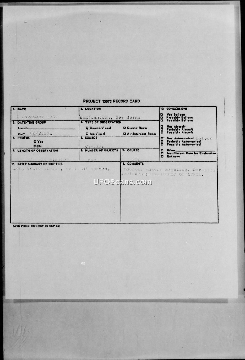 Project 10073 Record Card — Englishtown, New Jersey, 8 November 1957