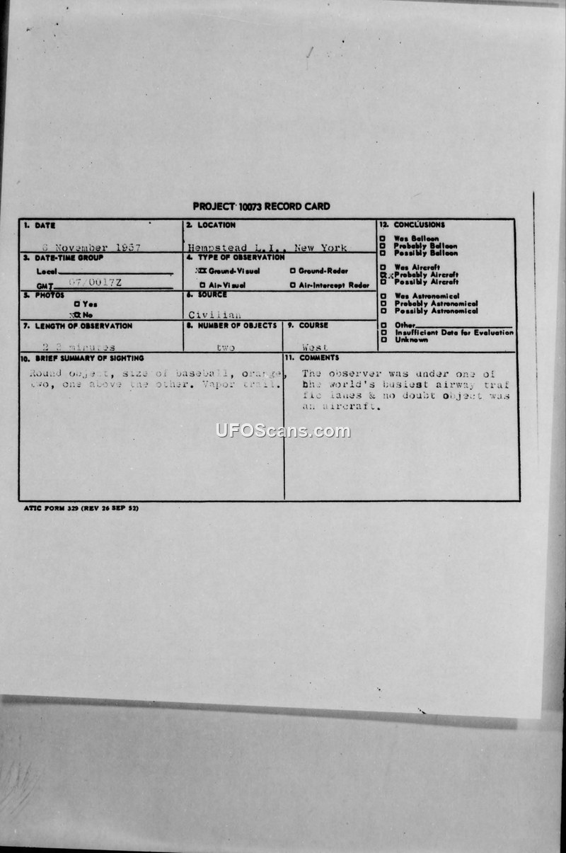 Project 10073 Record Card — Hempstead, L.I., New York, 6 November 1957