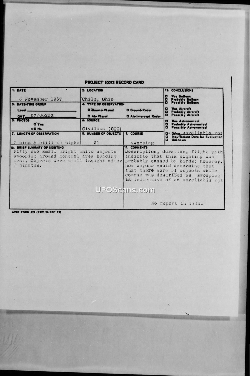 A 1957 civilian report of 51 swooping objects in Chilo, Ohio, was officially dismissed as likely being birds. The evaluator deemed the report unreliable due to the specific count of objects observed during the flight.