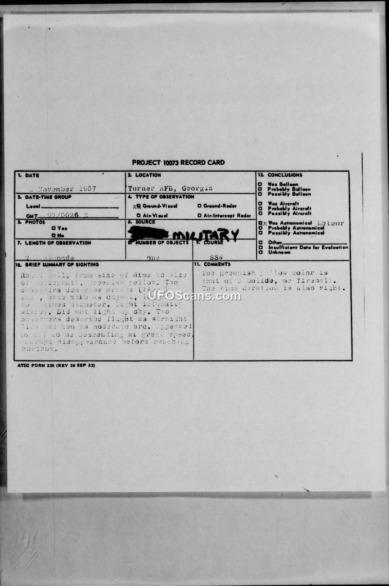 Project 10073 Record Card — Turner AFB, Georgia, 6 November 1957