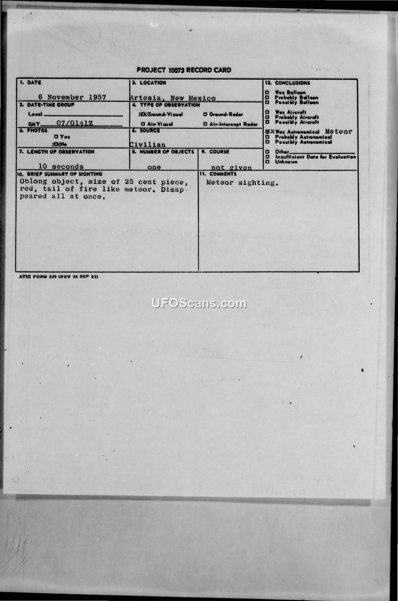 Military reports from November 1957 document two UFO sightings in Artesia, New Mexico. Investigators concluded the sightings were likely a meteor, a jet reflection, or the planet Venus, noting inconsistencies in witness testimony.