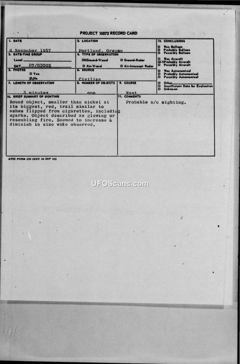 A sighting report from Portland, Oregon, on November 6, 1957, involving a glowing red object with a trail. The military concluded it was a probable aircraft sighting.