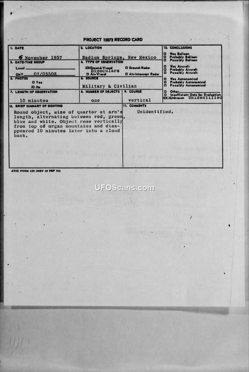 Project 10073 Record Card — Radium Springs, New Mexico, 6 November 1957