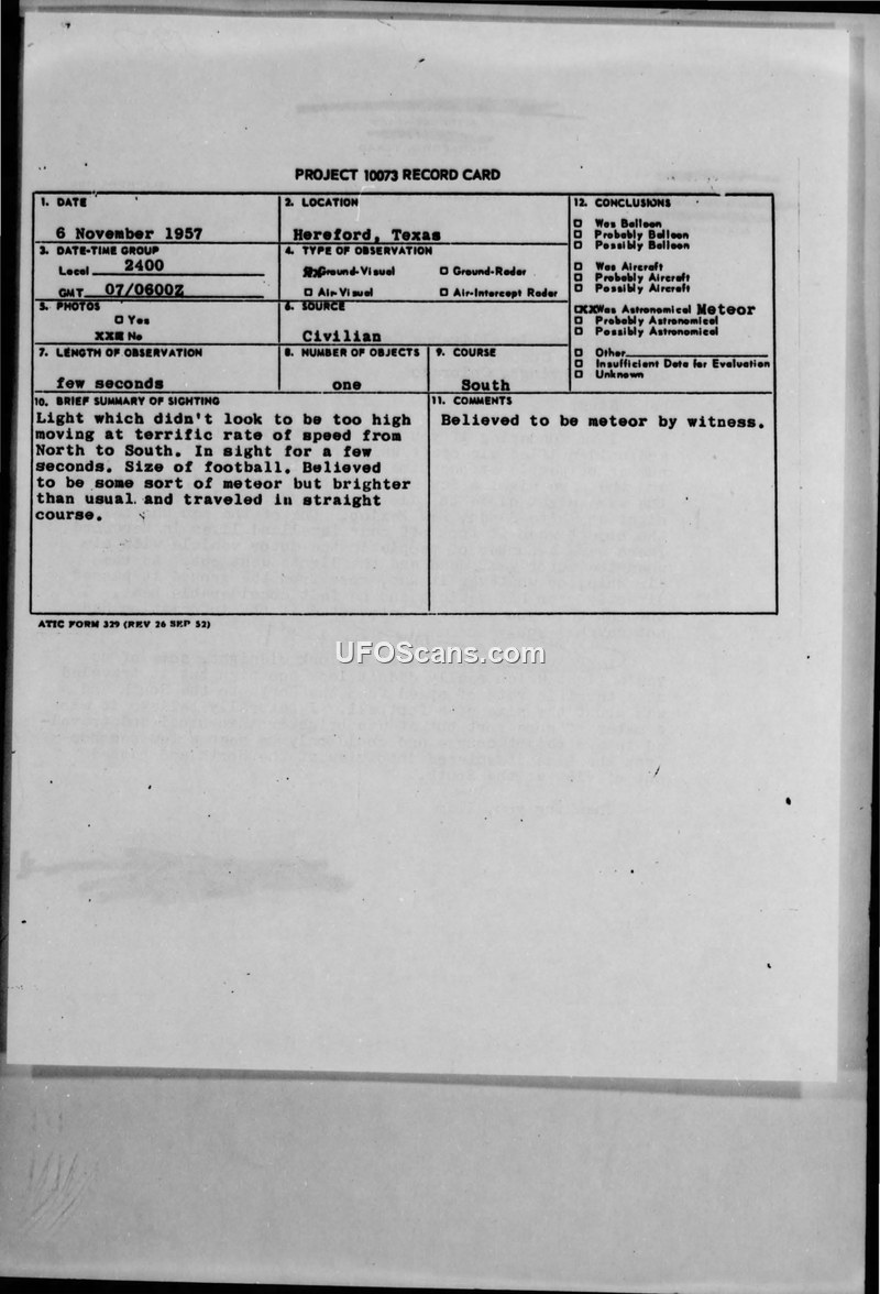 A witness in Hereford, Texas, reported a bright, fast-moving light on November 6, 1957. The Air Technical Intelligence Center investigated the report as part of a broader series of sightings in the Levelland area.