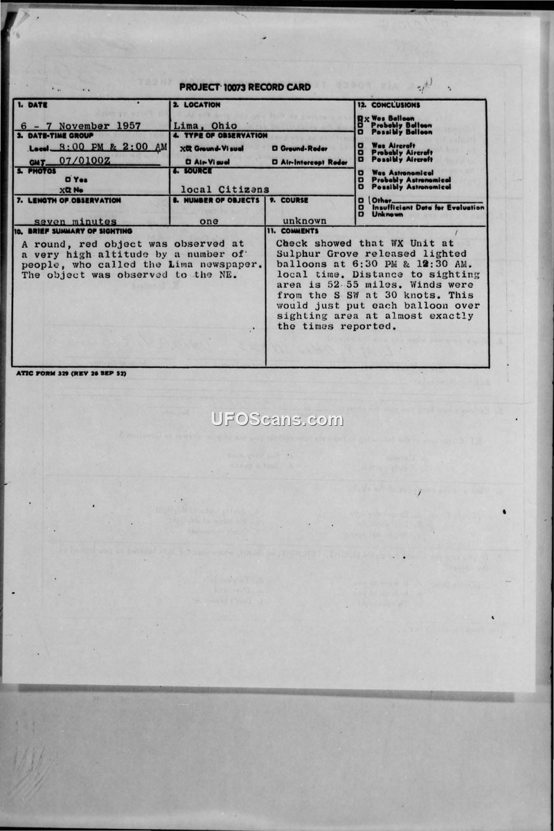 A November 1957 sighting of a glowing red object in Lima, Ohio, was investigated by the U.S. Air Force under Project 10073. The phenomenon was officially identified as lighted weather balloons released from Sulphur Grove, based on wind data and timing.