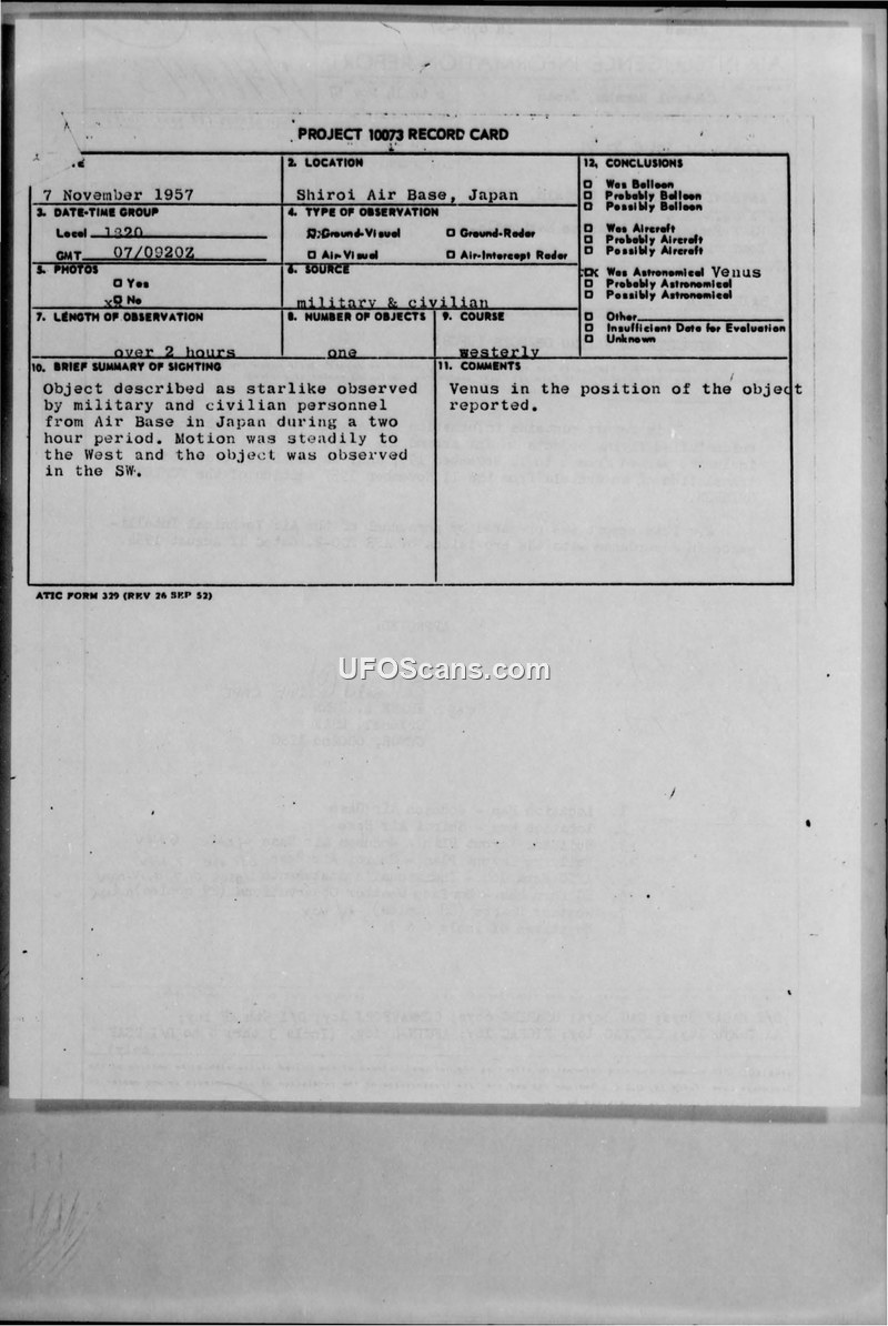 Air Intelligence Information Report: Unidentified Flying Objects (UFOs) - Shiroi and Johnson Air Bases, Japan, November 1957