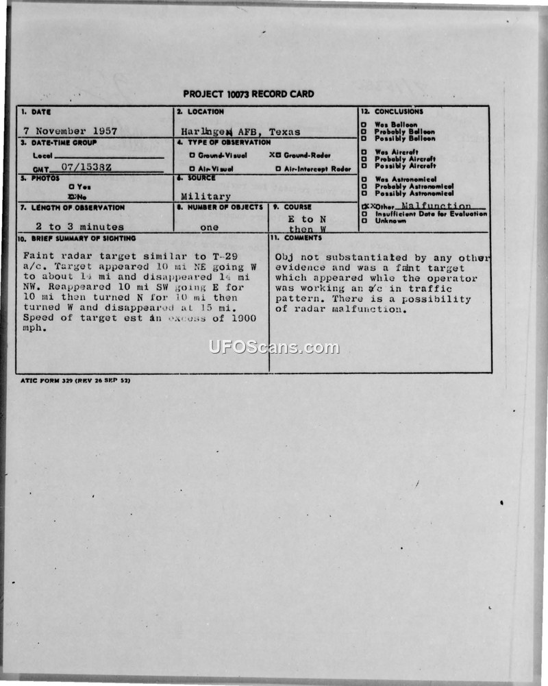 Project 10073 Record Card — Harlingen AFB, Texas, 7 November 1957