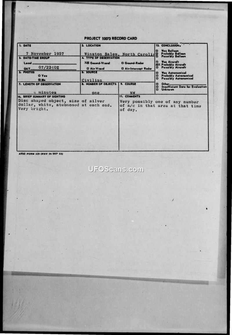 Project 10073 Record Card — Winston Salem, North Carolina, 7 November 1957