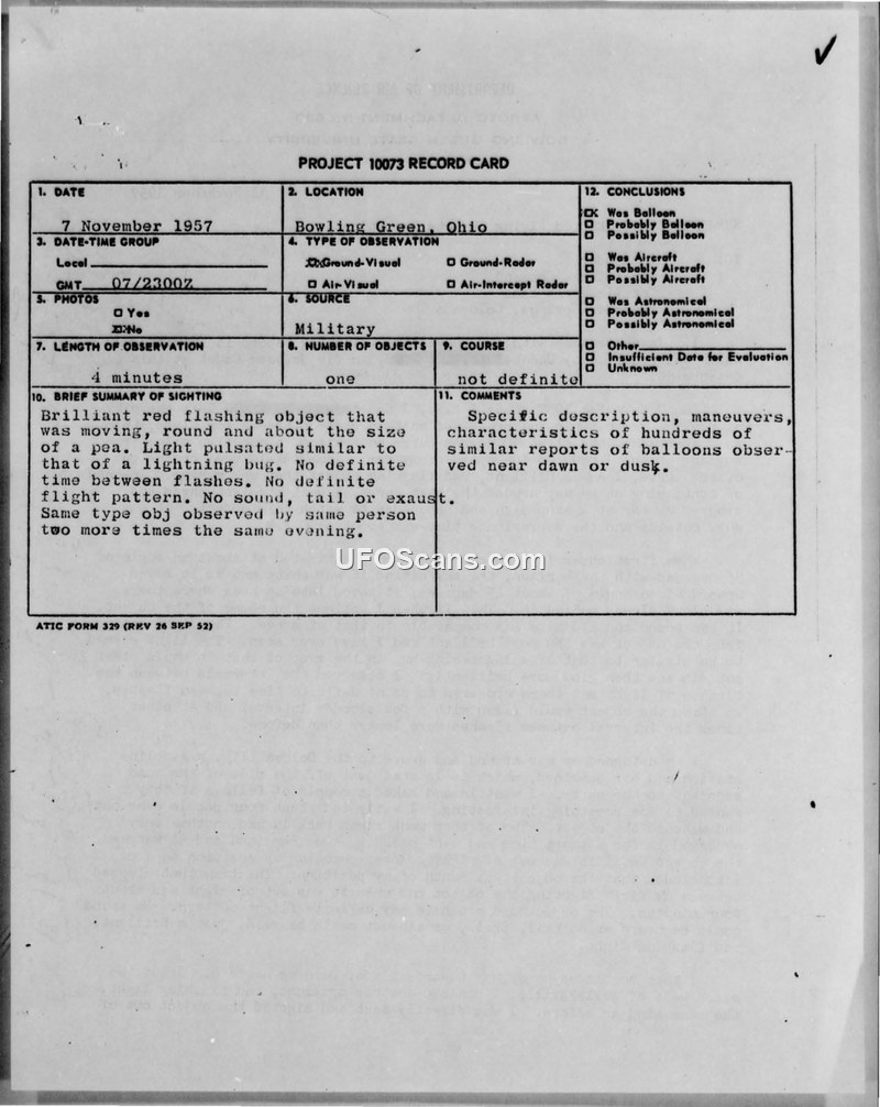A cadet reported a brilliant red, pulsating object in the sky near Bowling Green, Ohio, on 7 November 1957. The sighting was officially identified by the Air Technical Intelligence Center as a weather balloon.