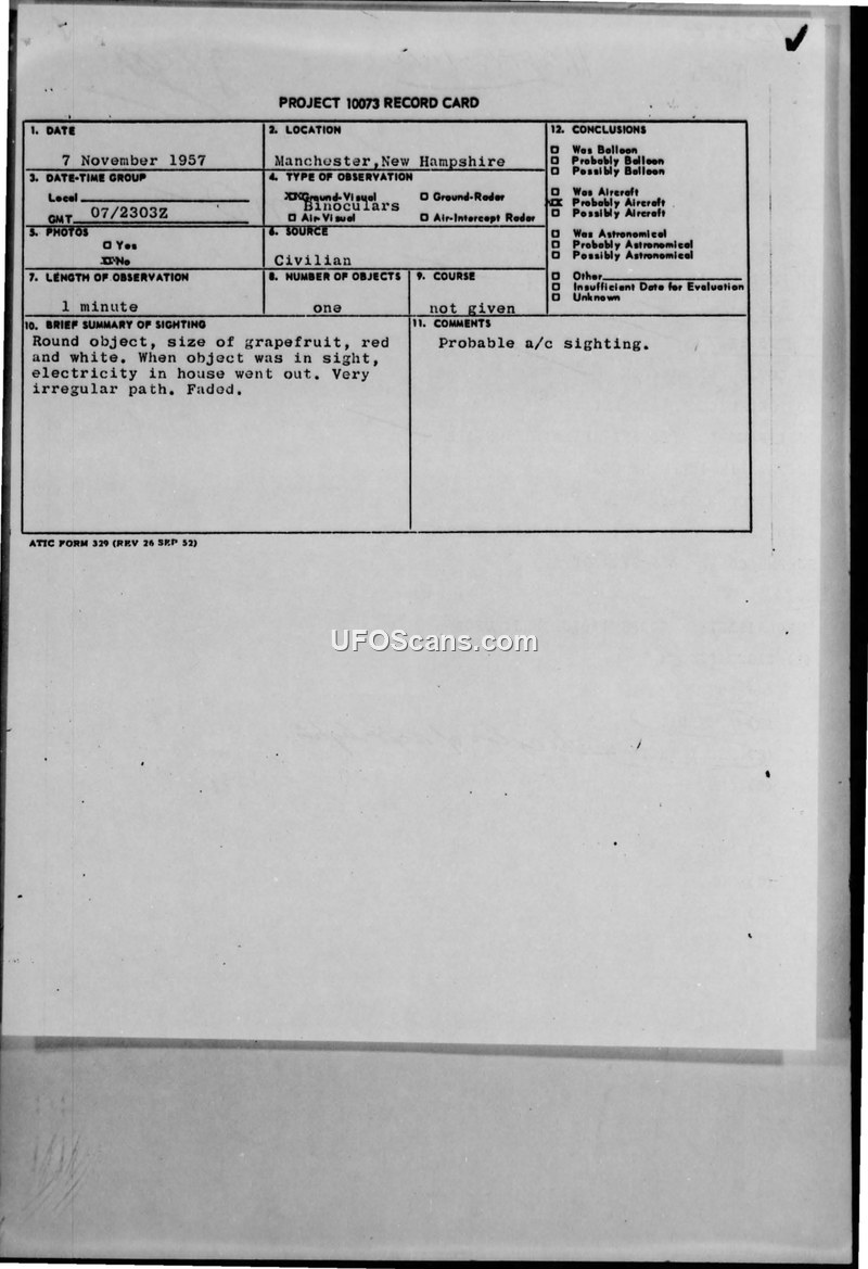 Project 10073 Record Card — Manchester, New Hampshire, 7 November 1957