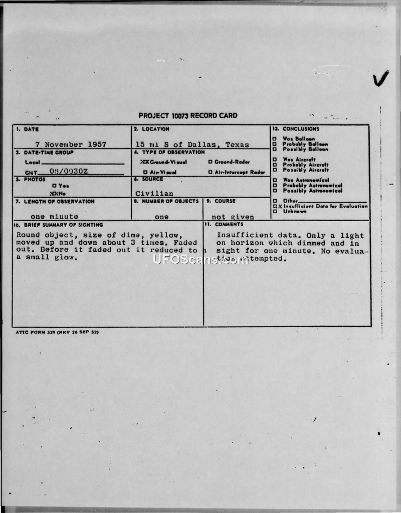 A civilian reported a yellow, round object moving vertically near Dallas, Texas, on November 7, 1957. The military investigation concluded there was insufficient data to identify the object, noting it could potentially be a balloon.