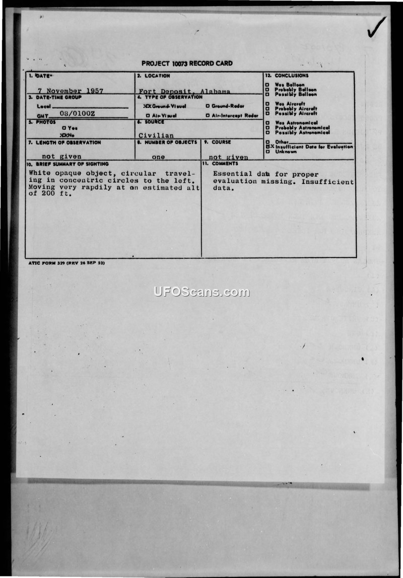 A 1957 sighting report from Fort Deposit, Alabama, involving a circular, white object moving in concentric circles. The military concluded the report lacked sufficient data for evaluation.