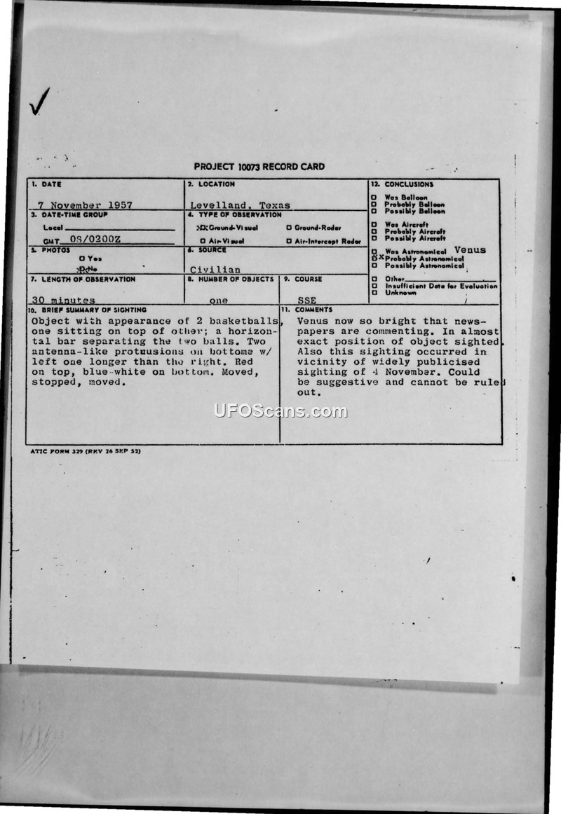 Project 10073 Record Card — Levelland, Texas, 7 November 1957