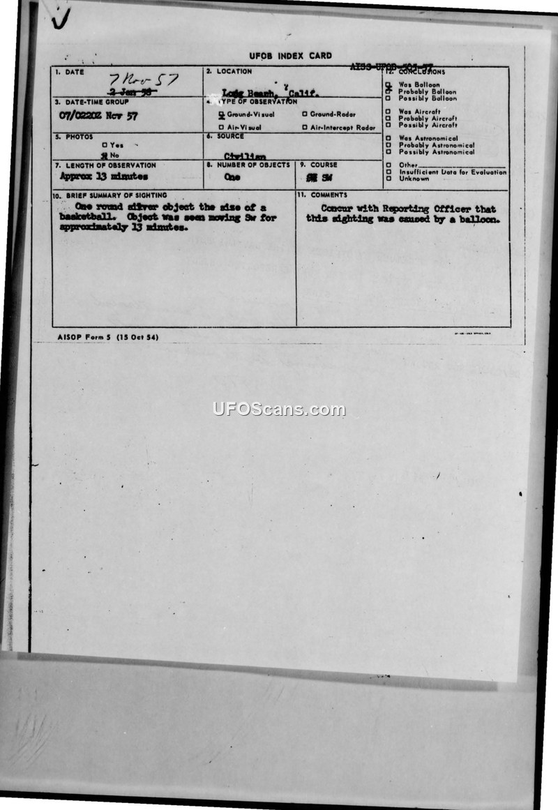 UFO Index Card and Incident Report — Long Beach, California, November 1957