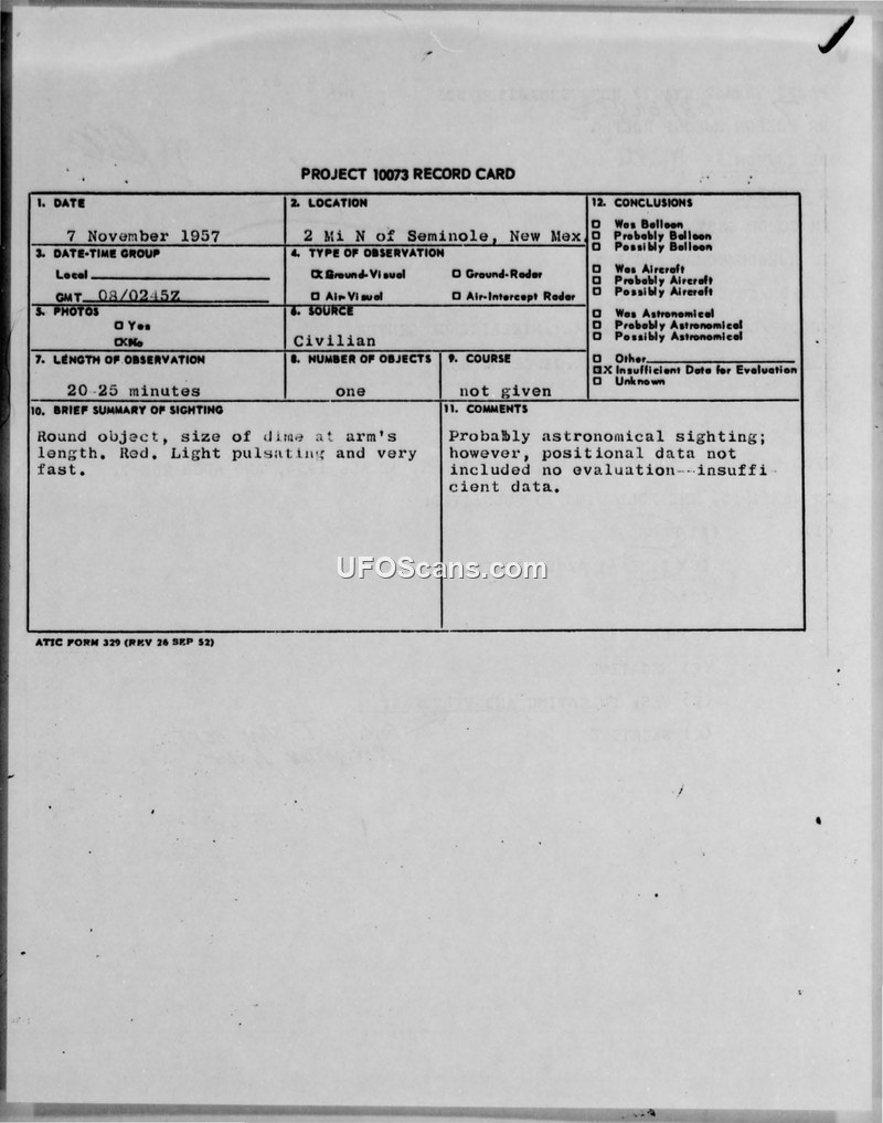 Project 10073 Record Card — 7 November 1957, Seminole, New Mexico