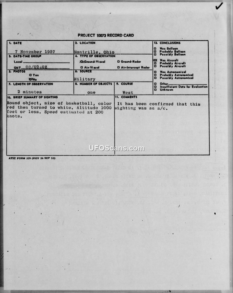 A 1957 sighting report from Montrille, Ohio, describes a basketball-sized object observed by a GOC staff sergeant. The military investigation concluded the object was an aircraft.