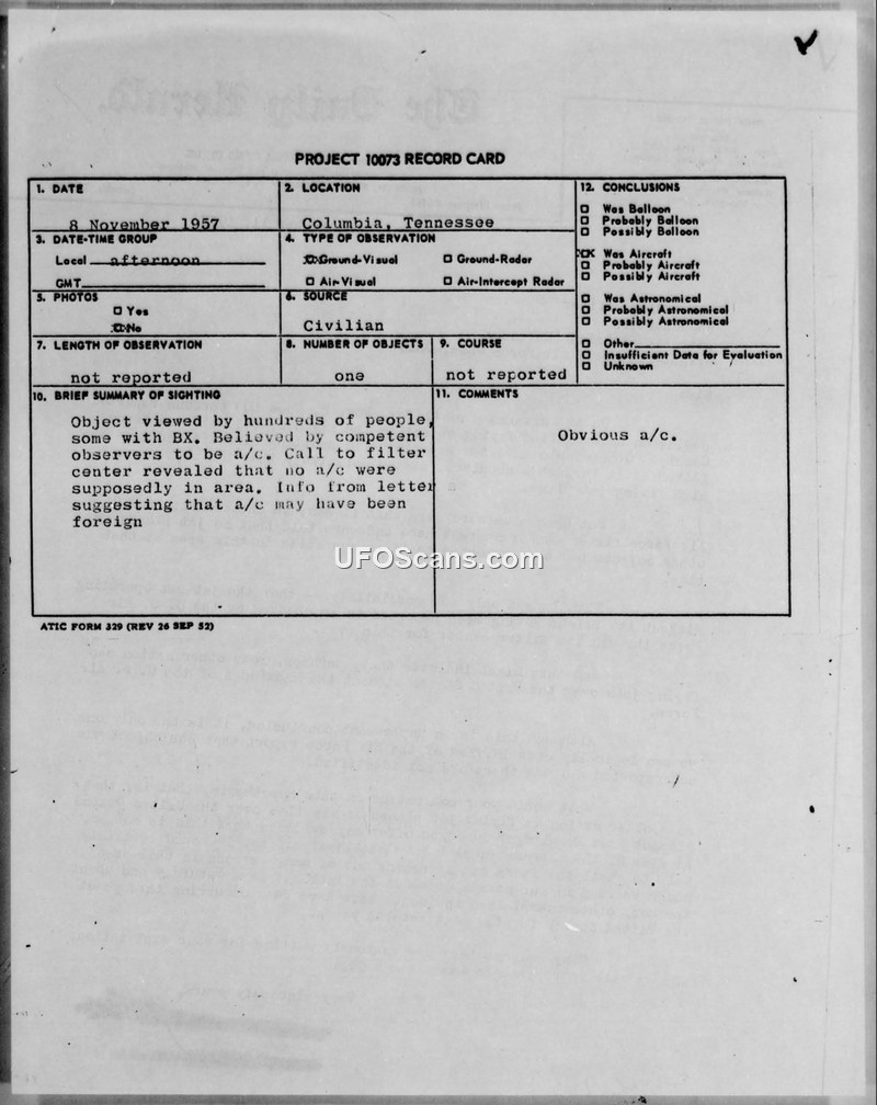 This document collection details a sighting of an unidentified flying object that occurred on the afternoon of November 8, 1957, over Columbia and Maury County, Tennessee. According to a letter from the local newspaper, The Daily Herald, approximately 100 people observed the object, with some witnesses using binoculars to identify it as a high-flying jet plane. The newspaper contacted the nearest U.S. Air Force filter center, which reported that no jet aircraft were operating in the area at that time. This led the newspaper to inquire whether foreign nations might be operating aircraft over the United States without the knowledge of the Air Force. The inquiry was forwarded through military channels, starting from the 58th Air Division (Defense) to the Eastern Air Defense Force, then to the Air Defense Command, and finally to the Air Technical Intelligence Center (ATIC) at Wright-Patterson Air Force Base. The official response, authored by Major Lawrence J. Tacker of the Office of Information Services, stated that the sighting had never been reported to ATIC. Major Tacker dismissed the suggestion that the object was a foreign aircraft or missile as entirely unfounded, citing a lack of evidence to support such a conclusion. The Project 10073 record card associated with the incident categorizes the object as an 'obvious a/c' (aircraft).