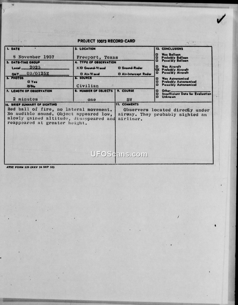 A USCG employee in Freeport, Texas, reported a red, glowing object in the sky on November 8, 1957. Military investigators concluded the sighting was likely an airliner flying along the Green 6 airway.
