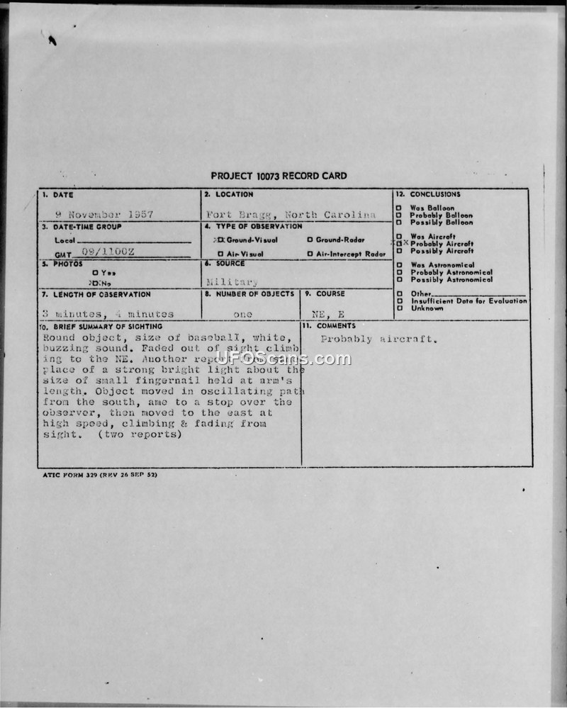 A 1957 Project 10073 record card documenting a sighting of a round, white, buzzing object at Fort Bragg, North Carolina. The official conclusion was that the object was probably an aircraft.