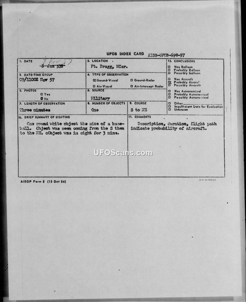Two military personnel at Fort Bragg reported an unidentified, oscillating, white object with a buzzing sound on 9 November 1957. While the official conclusion is 'unknown,' the report notes the proximity of aircraft landings at Pope AFB.