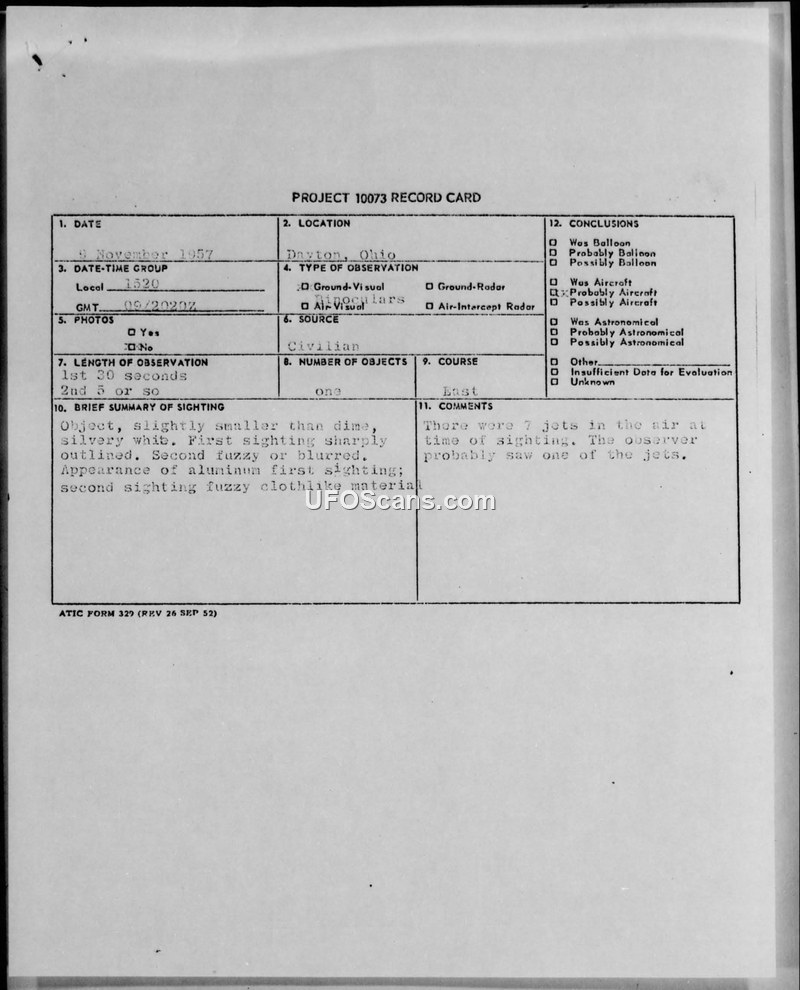 Project 10073 Record Cards and Technical Information Sheets — Dayton, Ohio, November 1957