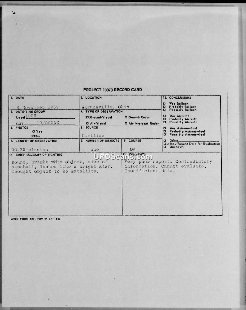 Project 10073 Record Card — Waynesville, Ohio, 9 November 1957