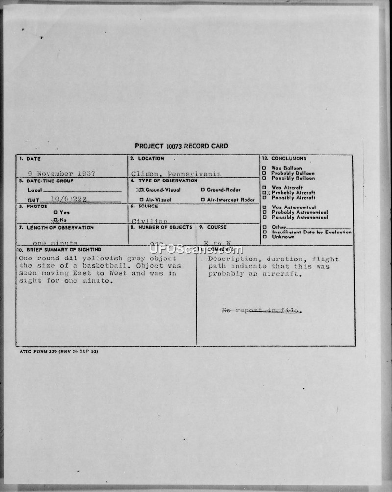 Project 10073 Record Card — 9 November 1957, Clinton, Pennsylvania