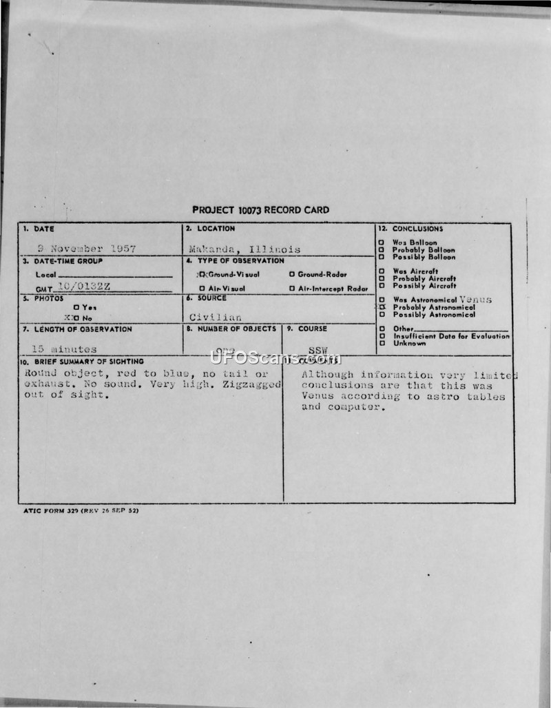 Project 10073 Record Card — 9 November 1957, Makanda, Illinois
