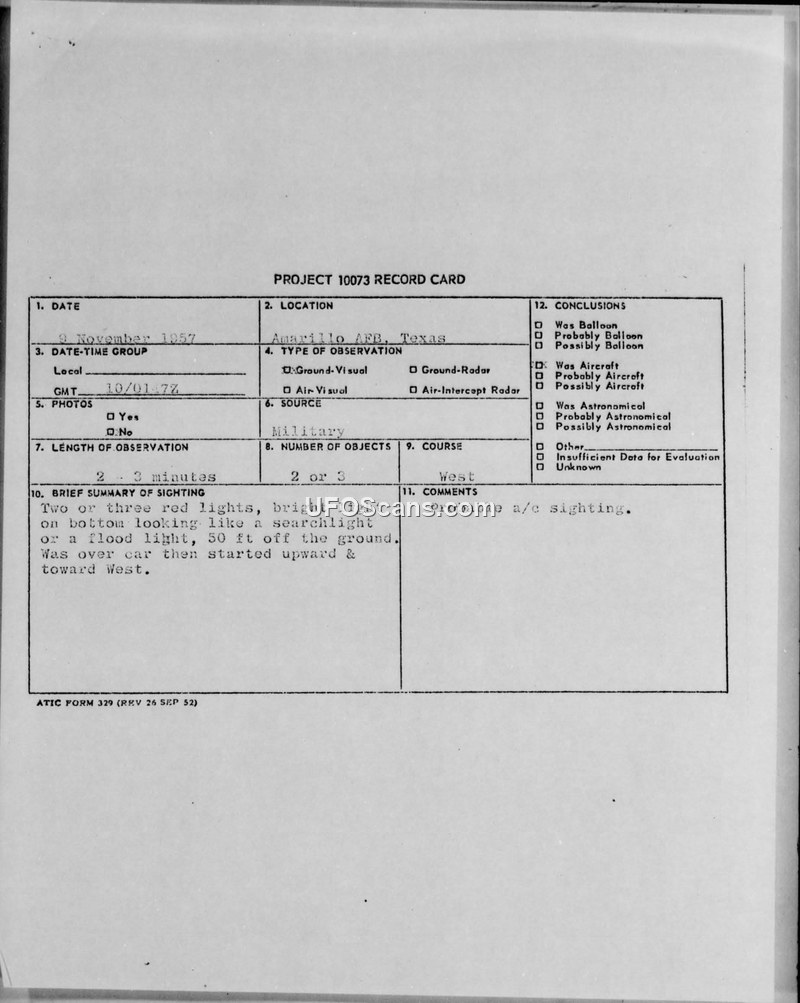 Unidentified Flying Object Report — Amarillo Air Force Base, Texas, November 1957