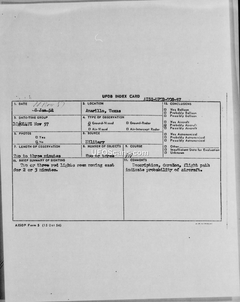 Unidentified Flying Object Report — Amarillo, Texas, 10 November 1957