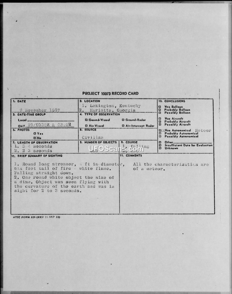 This document consists of two Project 10073 Record Cards detailing civilian sightings of unidentified aerial phenomena in November 1957. The first card records an incident on November 9, 1957, involving two separate observations in Lexington, Kentucky, and Marietta, Georgia. The first observation described a round, four-foot-diameter object with a six-foot white flame tail falling straight down for three to four seconds. The second observation described a round, white object the size of a dime flying with the curvature of the earth for two to three seconds. The official conclusion for these events was that the characteristics were consistent with a meteor. The second card records an incident on November 11, 1957, in Lexington, Kentucky. A civilian reported a round, orange object the size of a pinhead heading northeast for a duration of three minutes. The official conclusion for this sighting was that the description, duration, and flight path indicated it was likely an aircraft. The document notes that there was no further report in the file for the second incident.