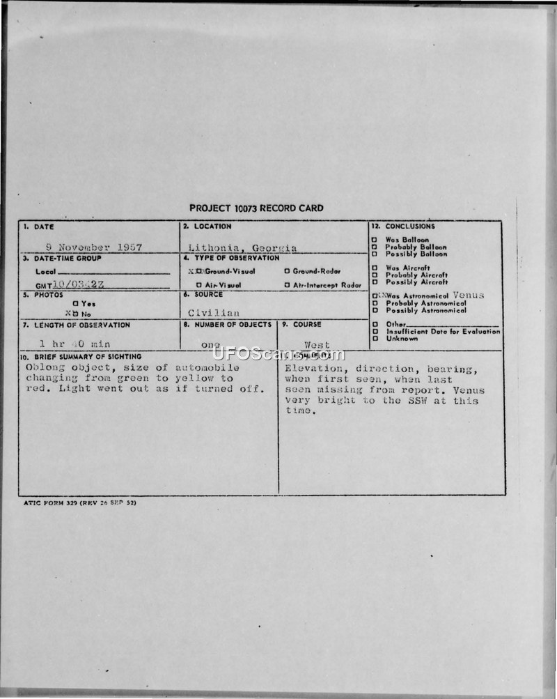 A 1957 sighting report from Lithonia, Georgia, describes an oblong, color-changing object observed for 100 minutes. The military investigation concluded the object was the planet Venus.