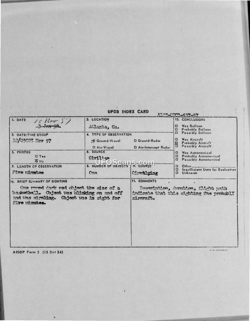 A 1957 UFOB Index Card records a civilian sighting of a round, red, basketball-sized object in Atlanta. The investigation concluded the object was likely an aircraft.