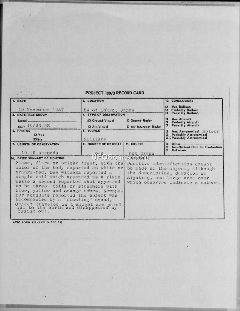 Project 10073 Record Card: Sighting over Tokyo, Japan, 10 November 1957