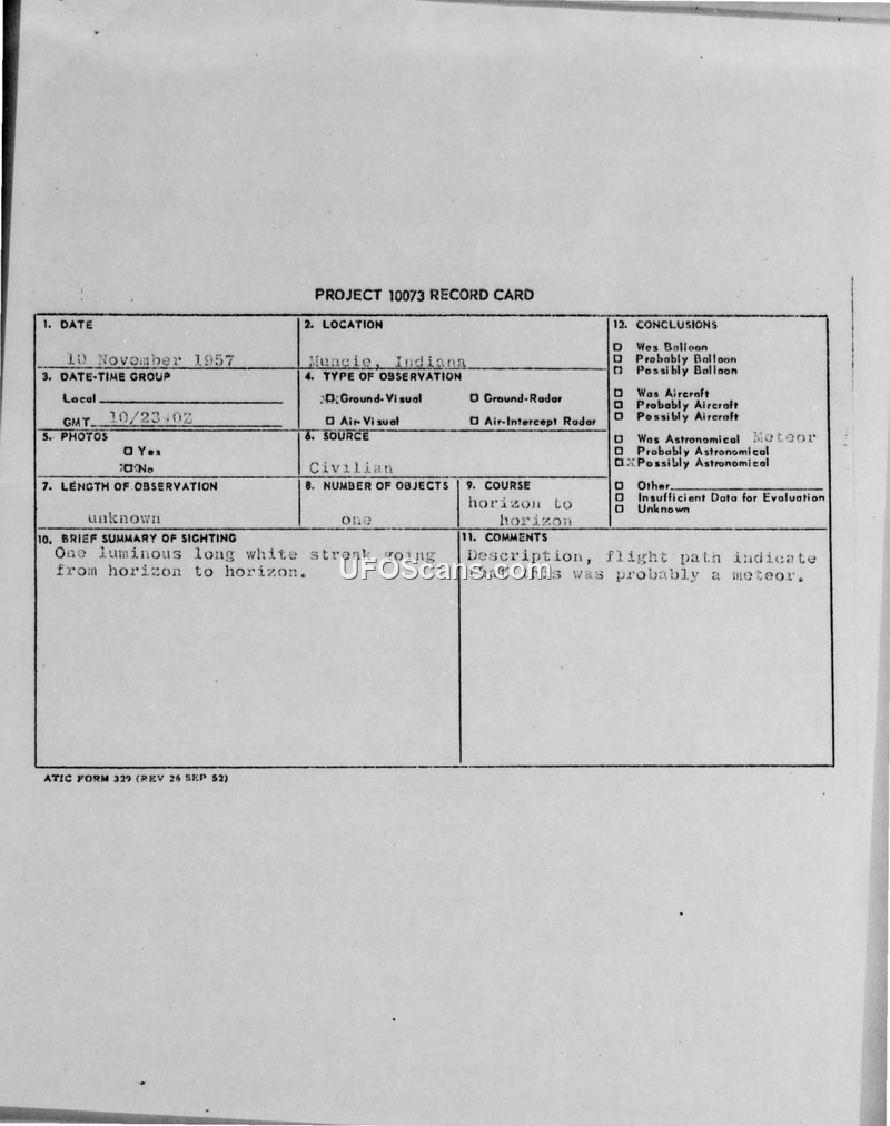 Project 10073 Record Card — Muncie, Indiana, 10 November 1957