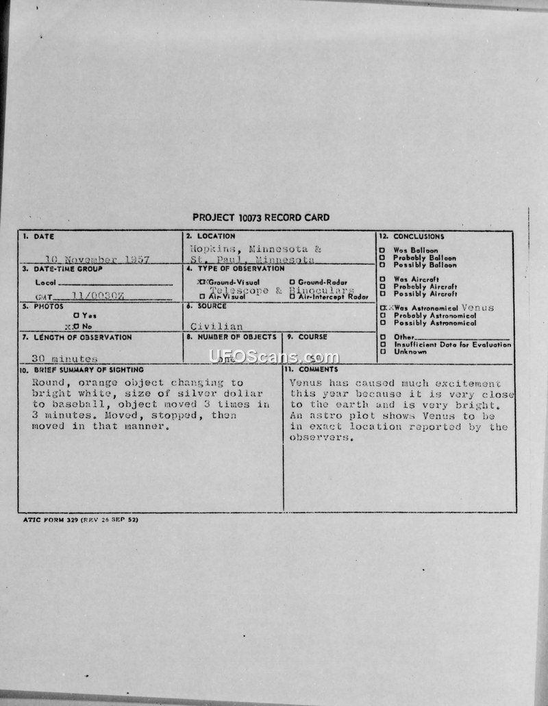 A 1957 sighting report from Minnesota describes a round, color-changing object observed through a telescope. Military intelligence concluded the object was the planet Venus.