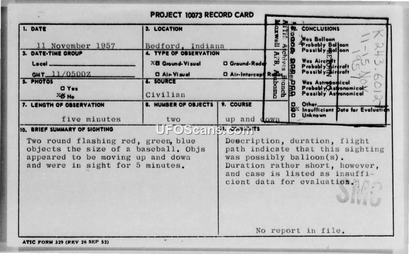This document consists of two Project 10073 record cards documenting civilian UFO sightings in Bedford, Indiana, during November 1957. The first incident occurred on November 11, 1957, at 0500Z. The witness reported two round objects, approximately the size of a baseball, flashing red, green, and blue. These objects were observed moving up and down for a duration of five minutes. The official conclusion for this event was that the description and flight path suggested a balloon, but due to the short duration and lack of further information, the case was classified as having insufficient data for evaluation. The second incident occurred on November 19, 1957, at 0100Z. The witness reported a single round object, described as the size of a dime and appearing white to red in color. This object remained stationary for twenty minutes. The official conclusion for this second sighting was that the description and flight path indicated the object was likely a star. Both cards note that there is no further report in the file, indicating these were summary records maintained by the Air Technical Intelligence Center (ATIC).