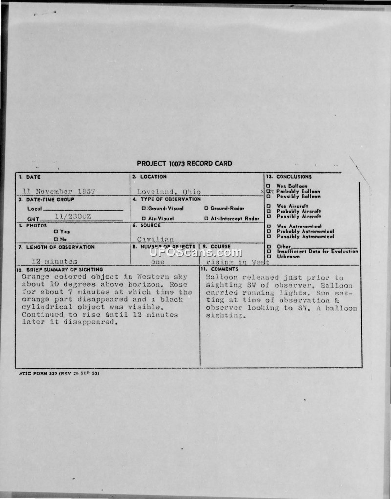 A school principal in Loveland, Ohio, reported a 12-minute sighting of an orange cylindrical object on November 11, 1957. The Air Force officially identified the object as a weather balloon released shortly before the sighting.