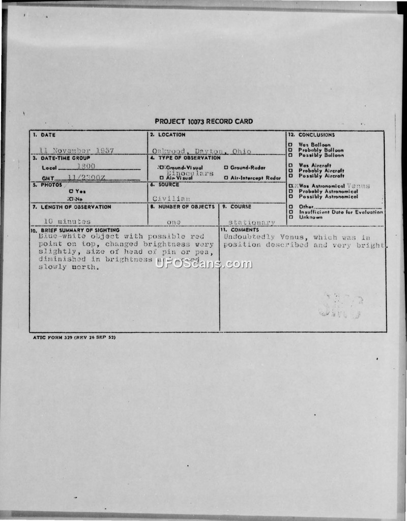 Project 10073 Record Card — Oakwood, Dayton, Ohio, 11 November 1957