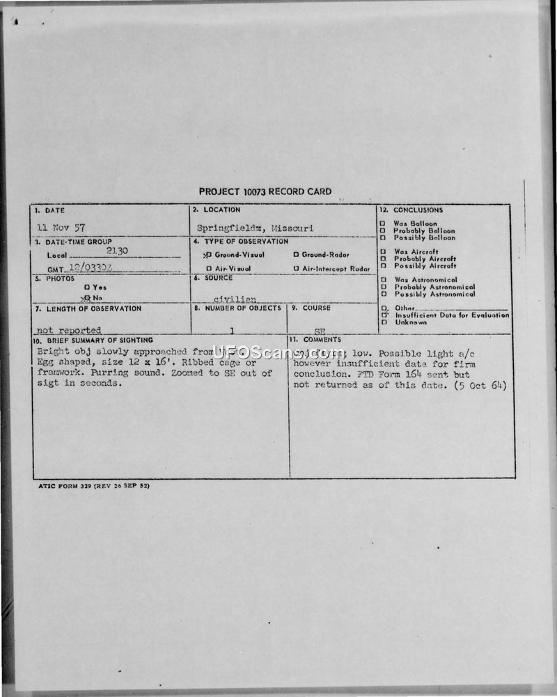 This document collection details a UFO sighting reported by a civilian in Springfield, Missouri, on November 11, 1957. The witness, a dock foreman for the Campbell 66 Trucking Company, observed a bright, egg-shaped object approximately 12 by 16 feet in size, featuring a ribbed cage or framework. The object approached slowly from the west, emitted a purring sound, and then zoomed to the southeast, disappearing in seconds. The witness and his wife, who also observed the event, did not report the incident until years later, after reading an article about flying saucers. In 1964, the witness contacted Project Blue Book to inquire if there were any official records of the event. The Foreign Technology Division (FTD) at Wright-Patterson Air Force Base responded to the inquiry, noting that their records indicated no reports from the Springfield area on that date. Major Maston M. Jacks of the Office of Information subsequently sent the witness an FTD Form 164, a technical information questionnaire, to facilitate a formal evaluation. However, the FTD concluded that due to the significant lapse of time—nearly seven years—it was impossible to positively identify the object, suggesting it was likely a misinterpretation of a conventional object. The file includes the original Project 10073 record card, internal military correspondence regarding the inquiry, and the letters exchanged between the witness and the Air Force.