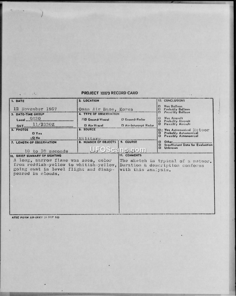 Unidentified Flying Object Report (UFOB) — Osan Air Base, Korea, 11 November 1957