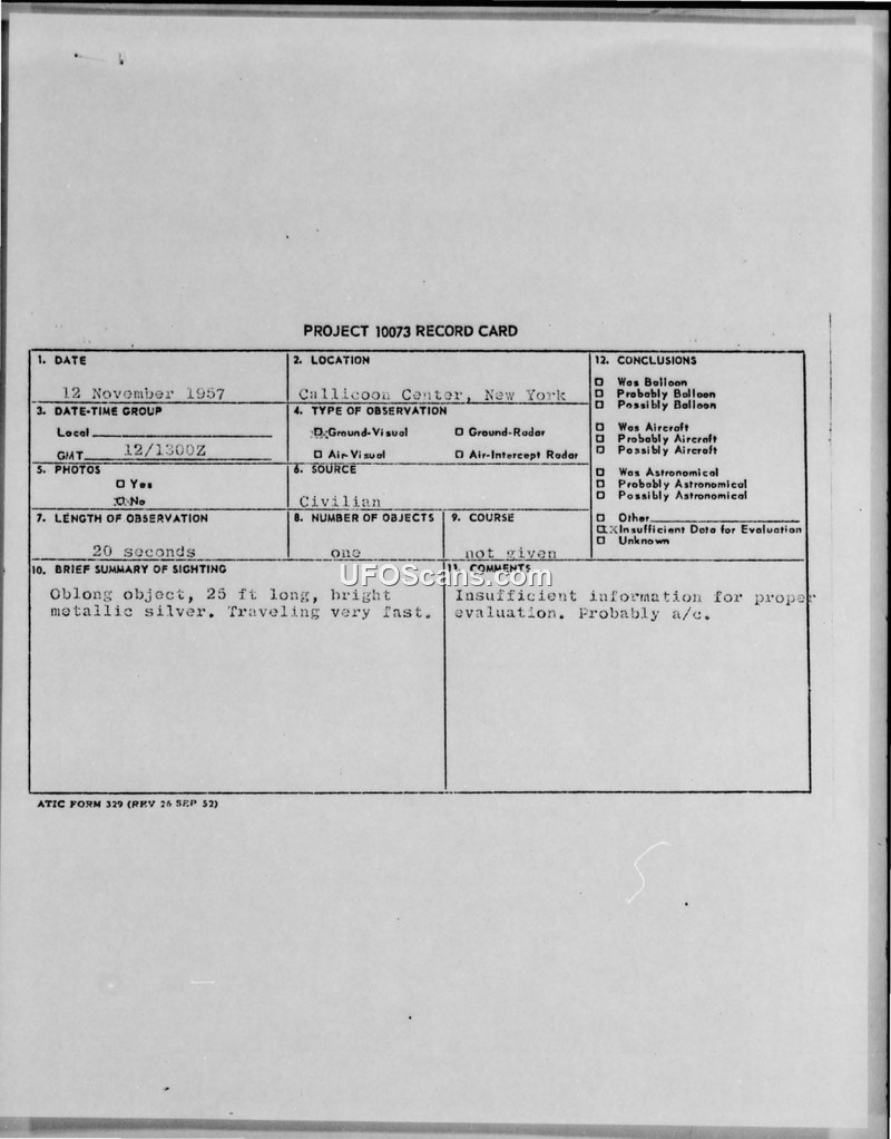 Project 10073 Record Card — Callicoon Center, New York, 12 November 1957