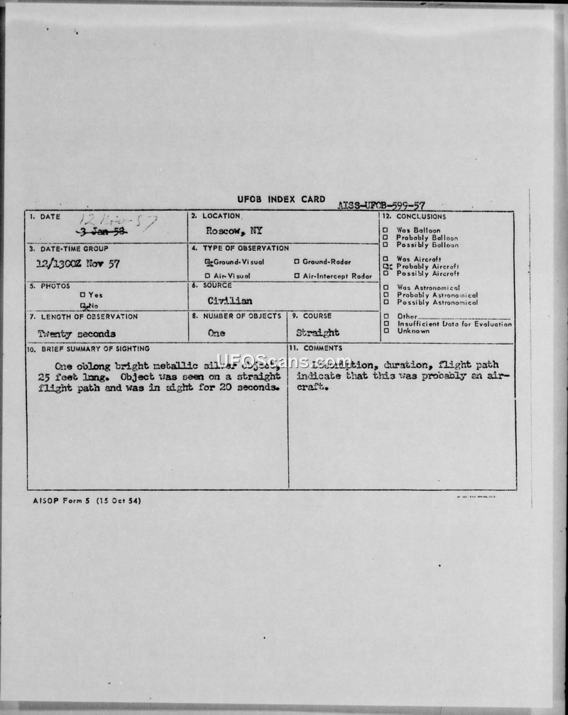 A civilian sighting of a 25-foot oblong metallic object in Roscow, NY, on November 12, 1957. The USAF investigation concluded the object was likely an aircraft.