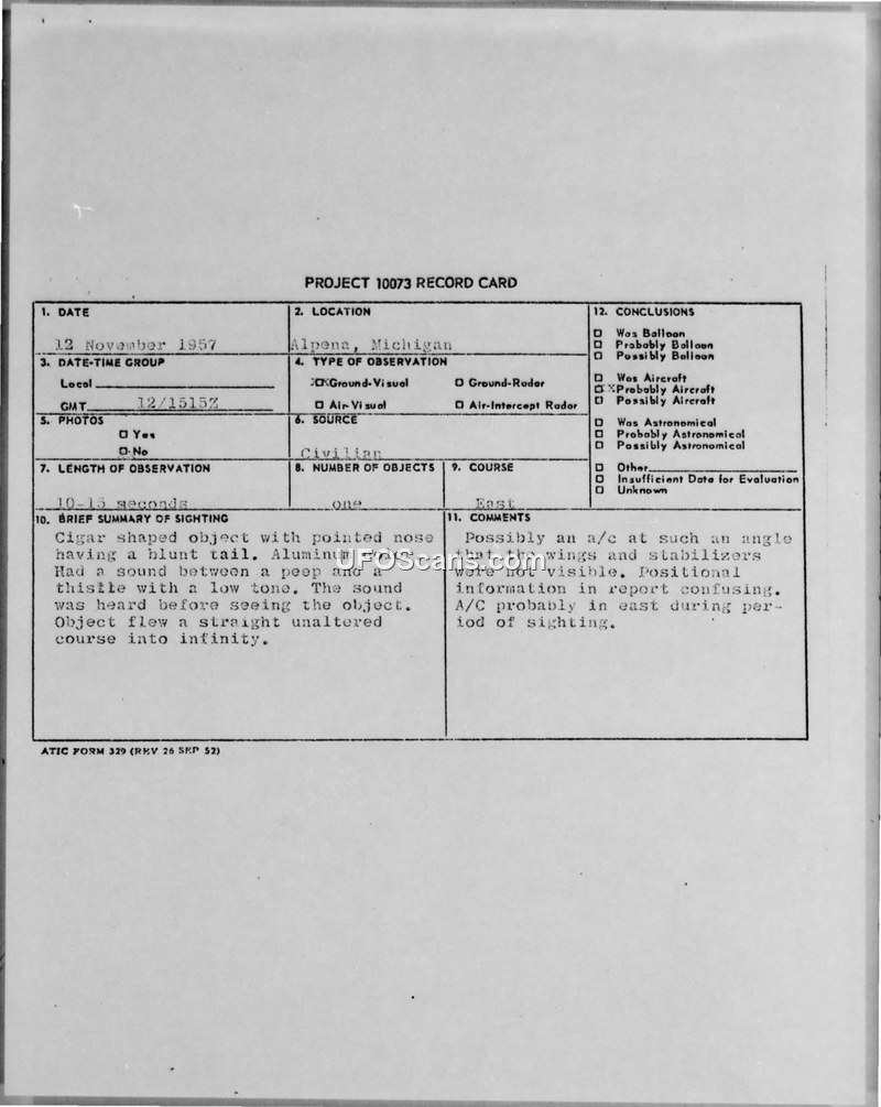 Project 10073 Record Card — Alpena, Michigan, 12 November 1957
